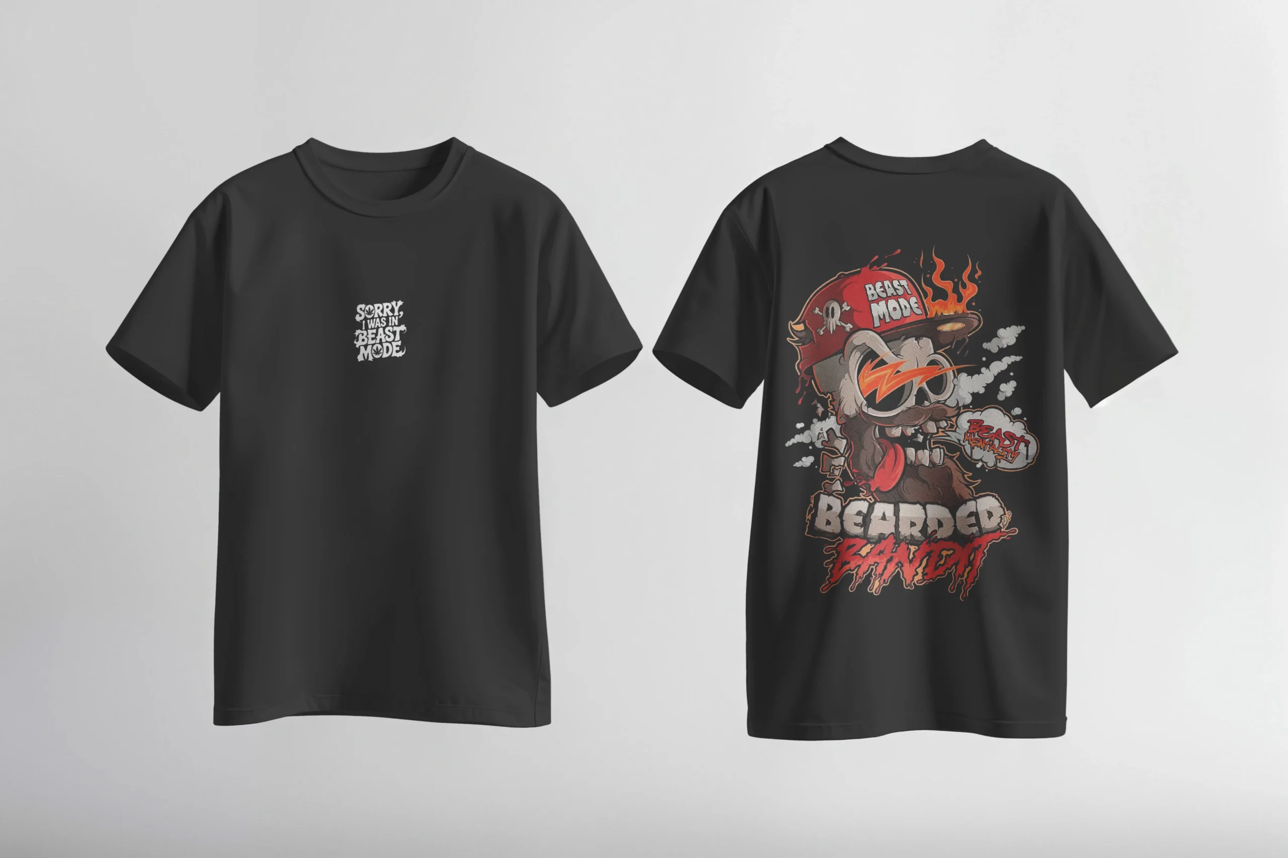 The front features the bold quote: “SORRY I WAS IN BEAST MODE”, while the back explodes with a fiery, graffiti-style graphic of a bearded skull character, complete with flames, shades, and pure attitude. It’s not just a shirt—it’s a statement.